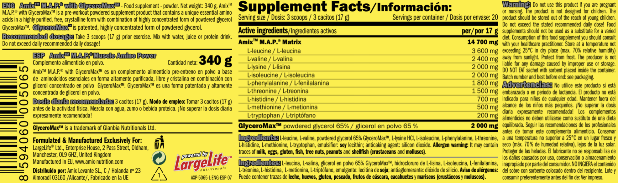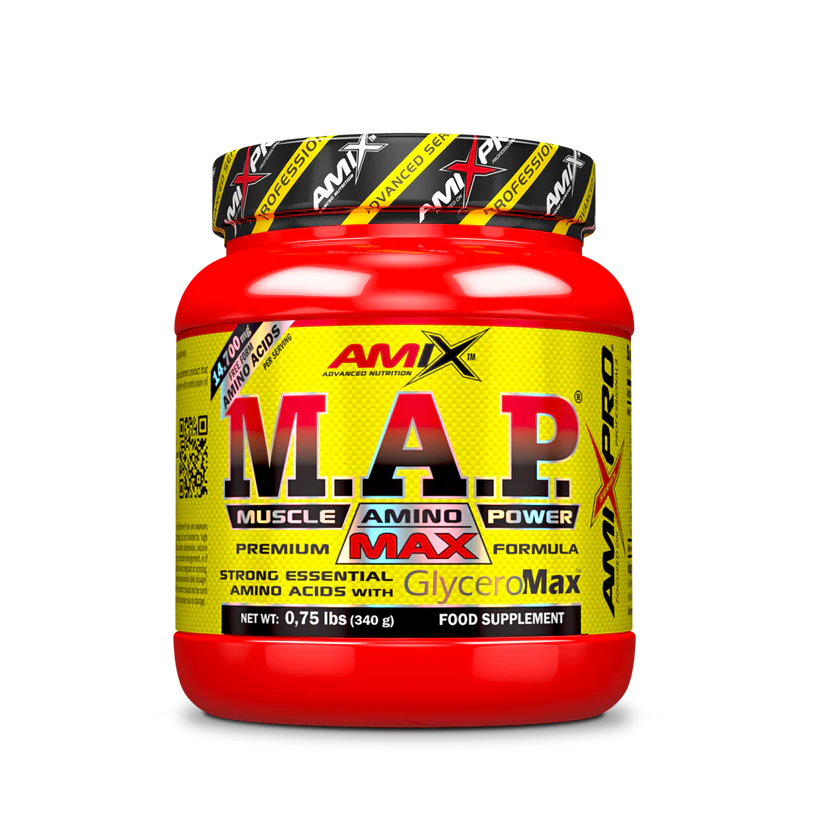 Los MAP Powder Amix Pro® son un suplemento de aminoácidos esenciales en polvo diseñado para mejorar la recuperación muscular, proteger la masa magra y apoyar el rendimiento durante entrenamientos intensos. El sistema M.A.P. (Master Amino Pattern) aporta aminoácidos libres en una proporción específica que favorece una absorción rápida y un aprovechamiento eficiente por el organismo.