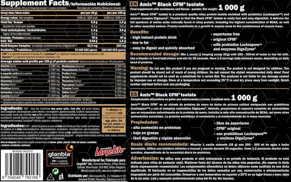 La Black CFM Isolate es una proteína aislada de suero diseñada para deportistas que buscan máxima pureza, rápida absorción y un aporte proteico limpio. Está elaborada mediante el proceso CFM® (Cross-Flow Microfiltration), un sistema avanzado que permite obtener una proteína de alta calidad con niveles muy bajos de grasas, carbohidratos y lactosa.