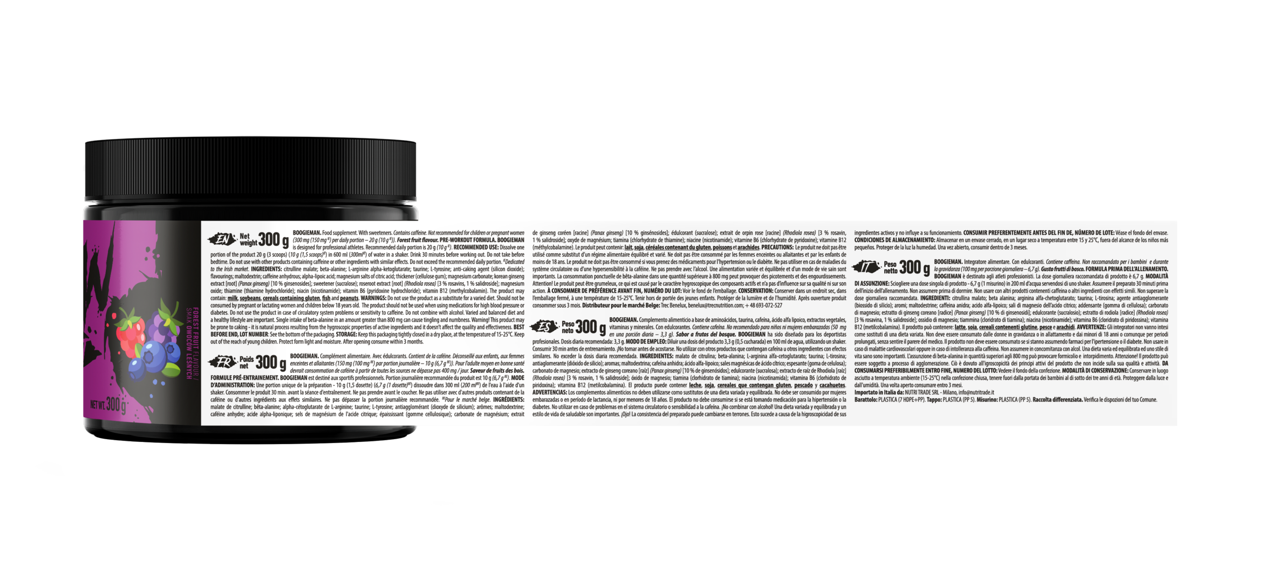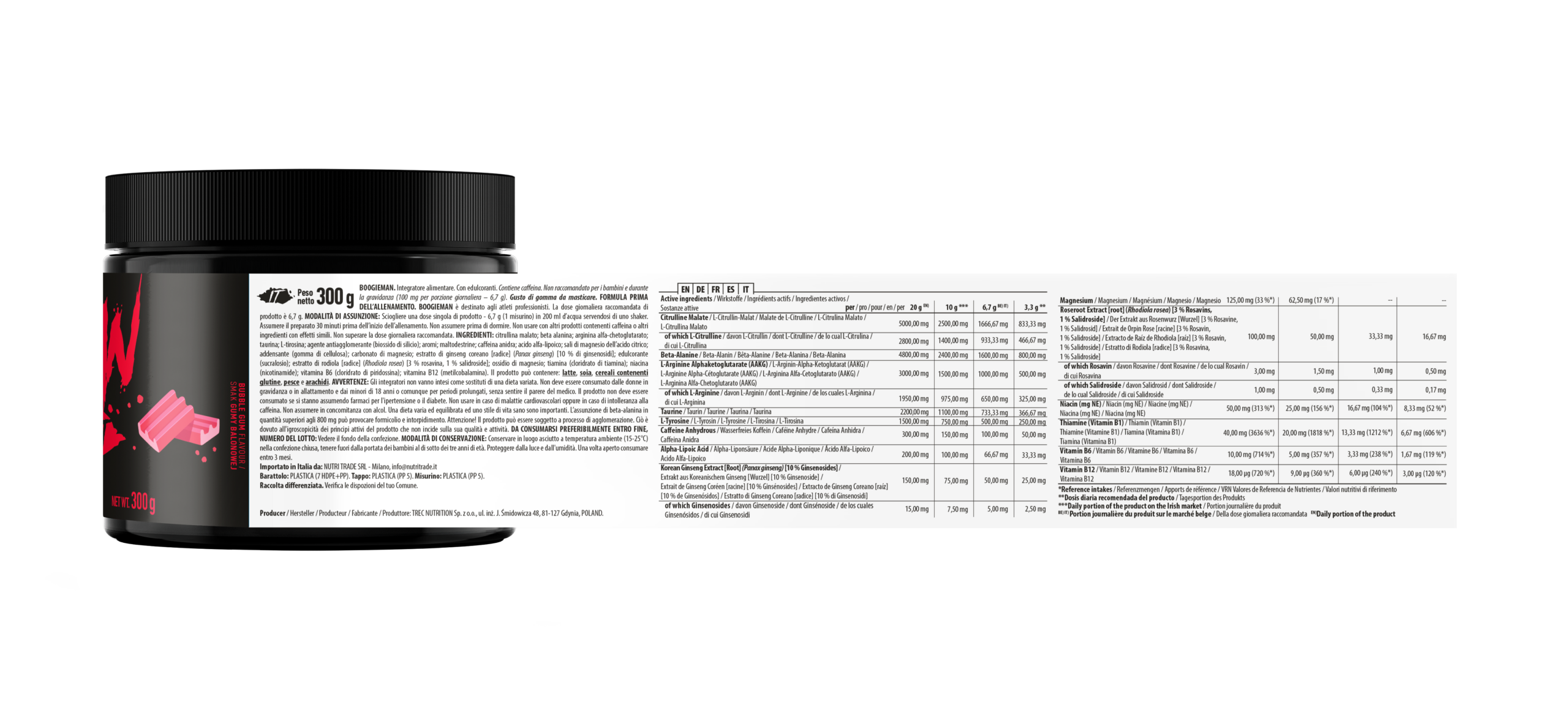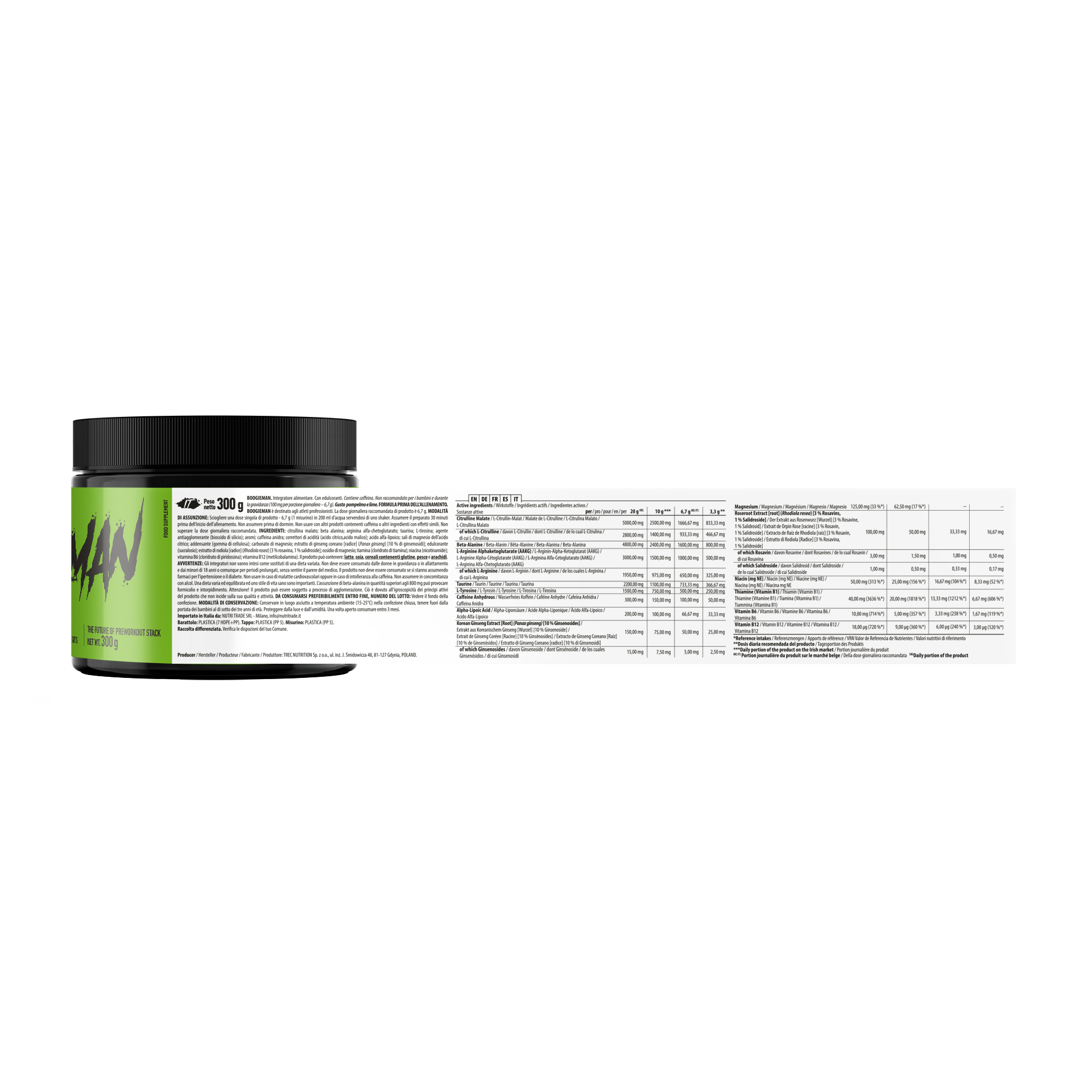Boogieman Pre Entreno Trec es un complemento alimenticio en formato polvo presentado en envase de 300 gramos. Está diseñado para integrarse dentro de rutinas deportivas estructuradas y sesiones de entrenamiento de distinta intensidad.