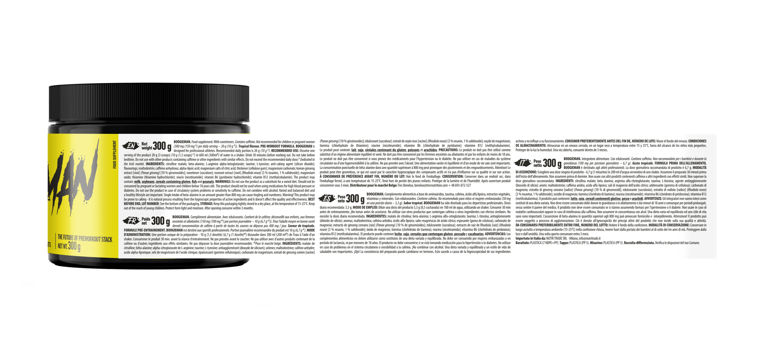 Boogieman Pre Entreno Trec 300 g en formato práctico y fácil de preparar. Presentación pensada para integrar su fórmula en la rutina deportiva diaria.