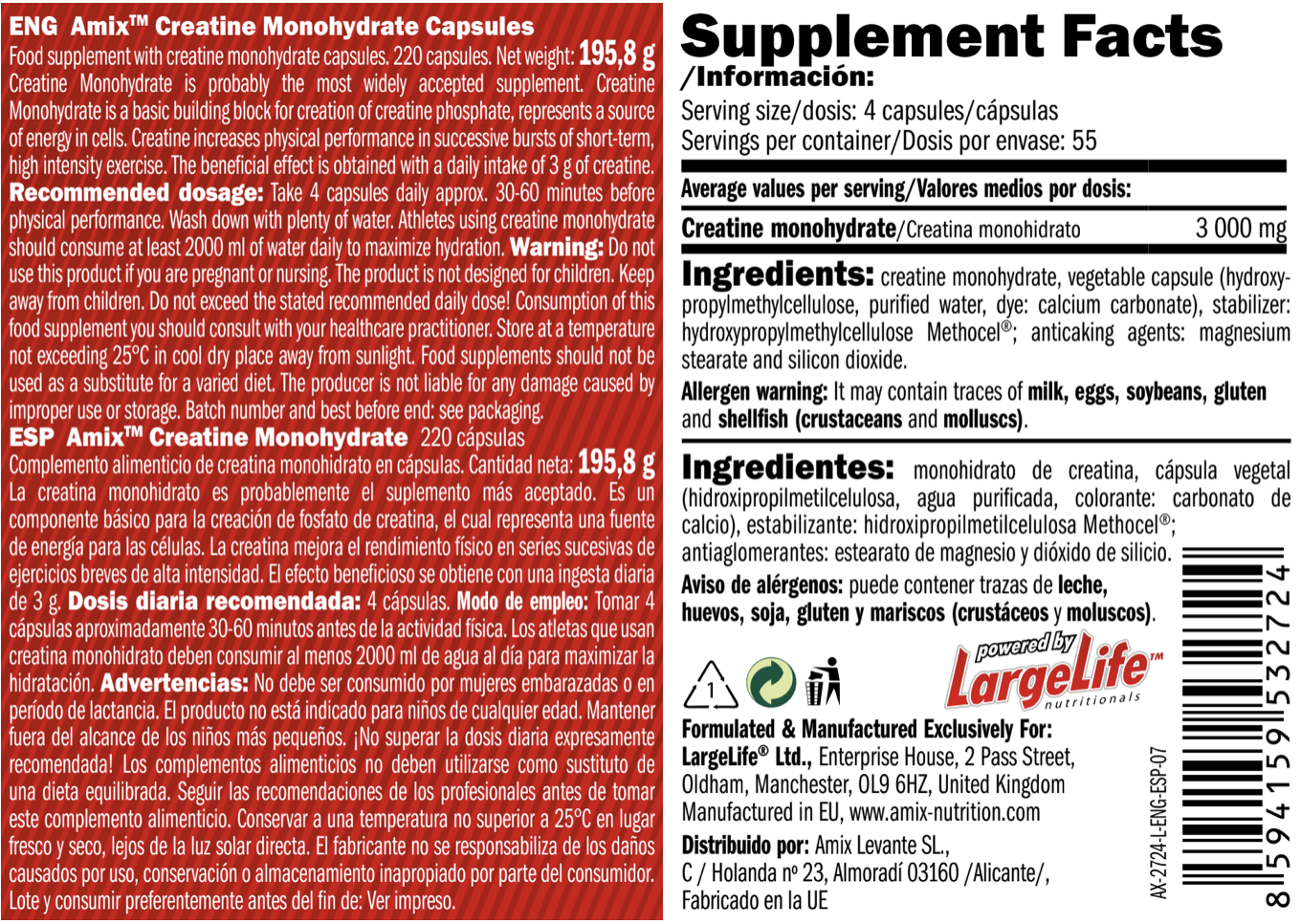 La Creatina Monohidrato 220 cápsulas – Amix™ es un complemento alimenticio formulado con creatina monohidrato de alta pureza, presentada en un formato práctico y fácil de usar. Esta versión en cápsulas está pensada para quienes buscan una dosificación precisa y un consumo cómodo, sin necesidad de mezclar polvos ni preparar batidos.