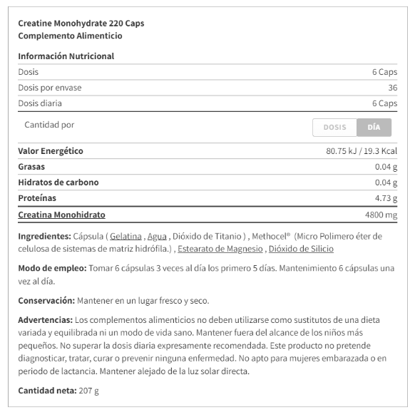 La creatina monohidrato es una de las formas de creatina más utilizadas en nutrición deportiva debido a su estabilidad y versatilidad. La versión en cápsulas permite aprovechar estas características con una experiencia de uso más cómoda. El envase de 220 cápsulas proporciona un suministro prolongado, ideal para quienes buscan continuidad y facilidad de uso.
