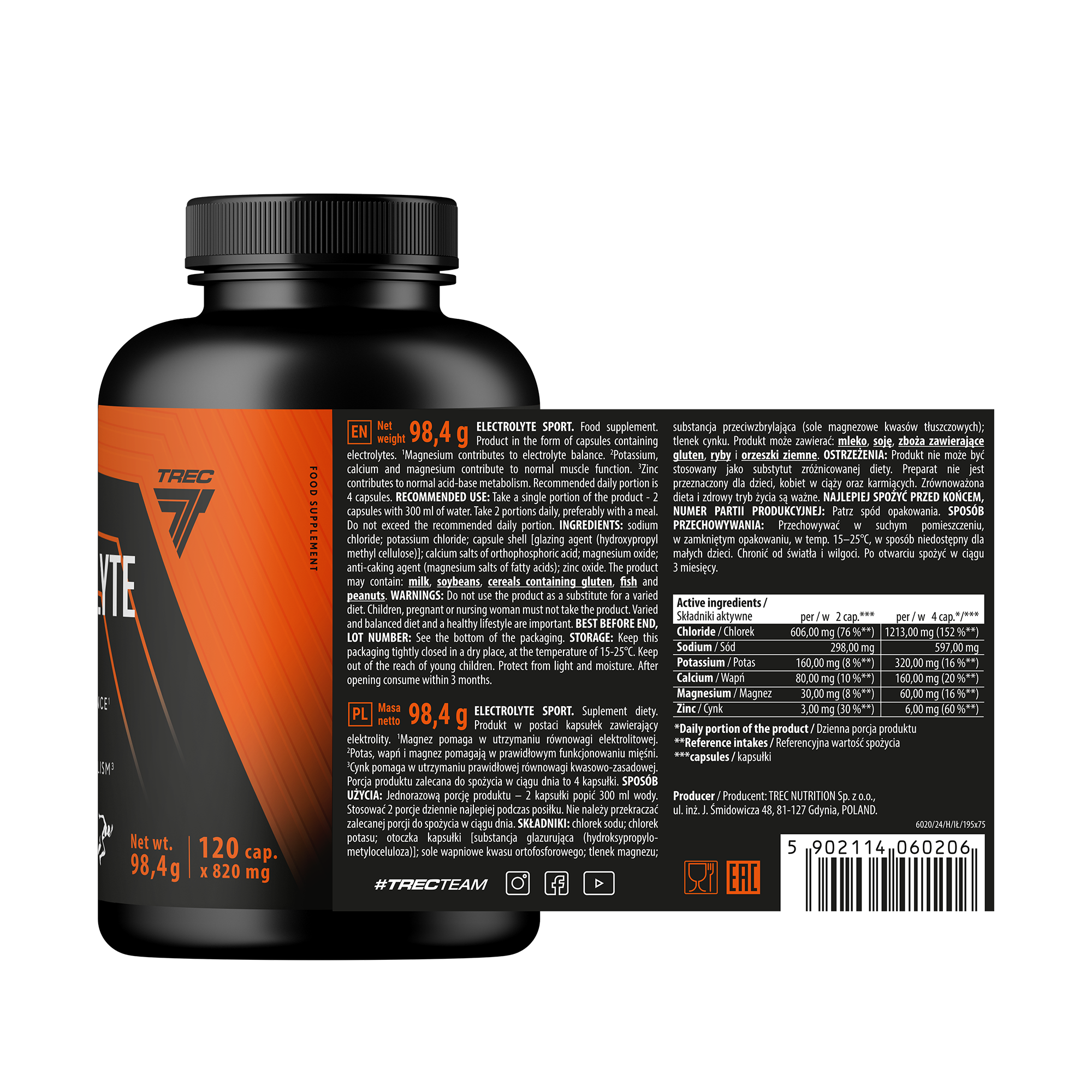 Endurance Electrolyte Trec es un complemento alimenticio presentado en envase de 120 cápsulas, formulado con una combinación de electrolitos orientada a integrarse dentro de rutinas deportivas estructuradas.