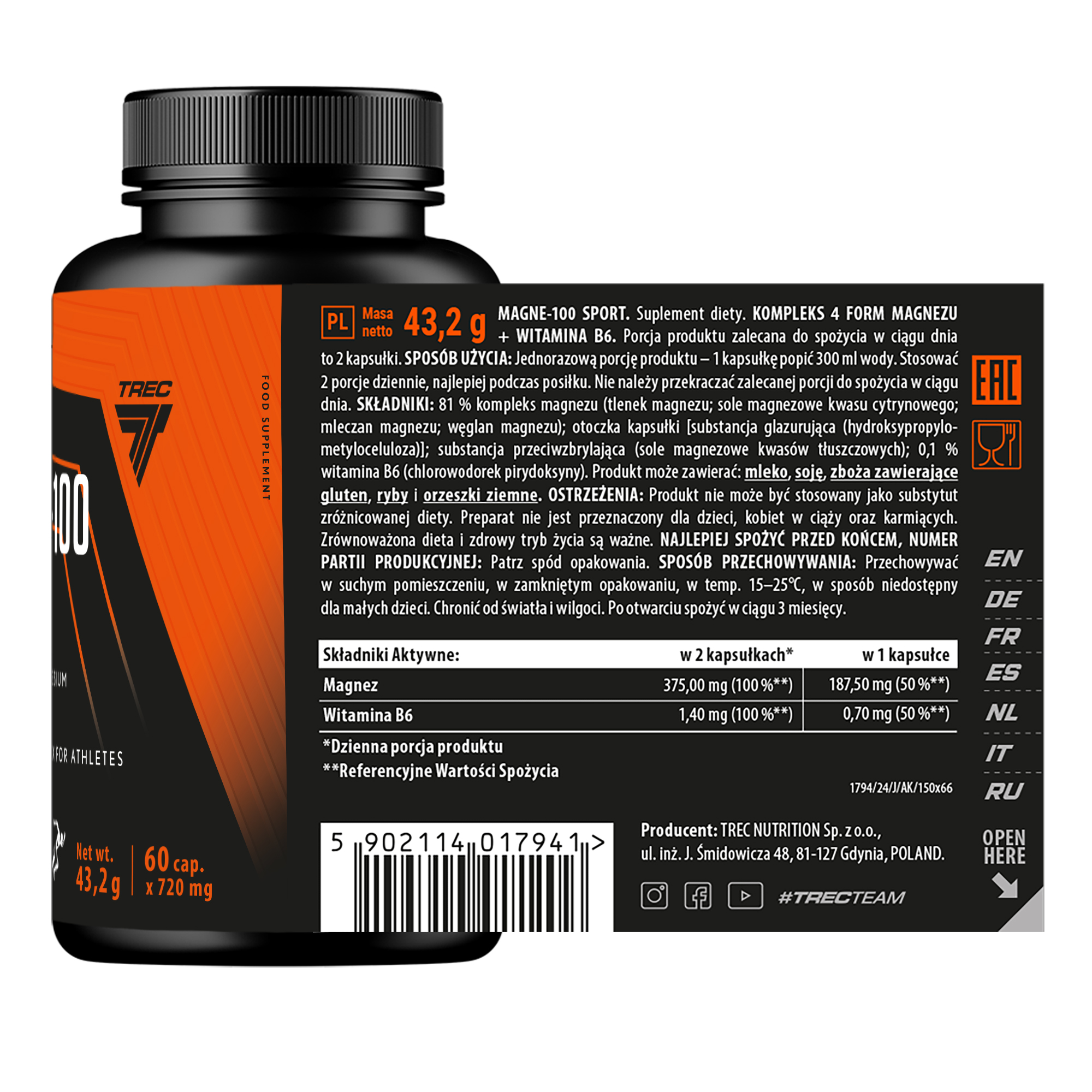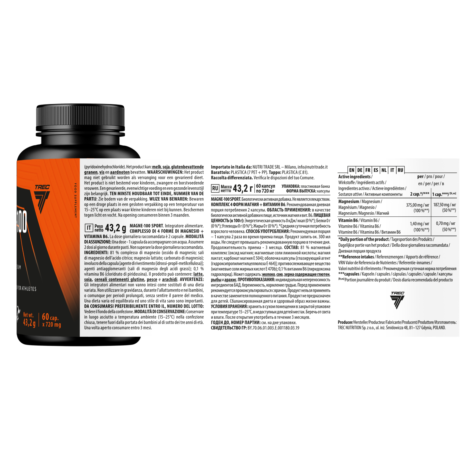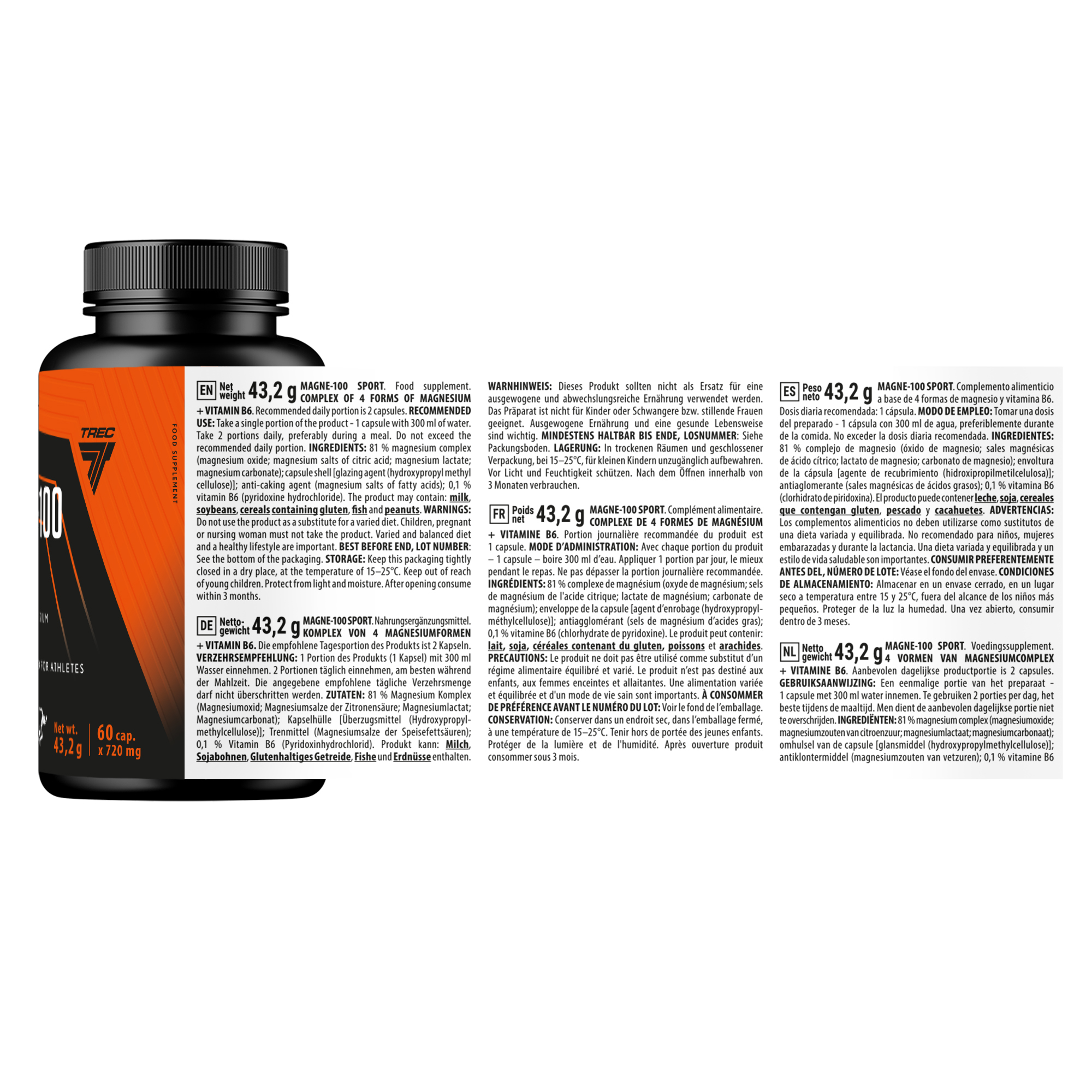 Endurance Magne 100 Trec es un complemento alimenticio en cápsulas presentado en envase de 60 unidades. Está formulado con magnesio y diseñado para integrarse dentro de rutinas deportivas estructuradas y planes de suplementación diaria.