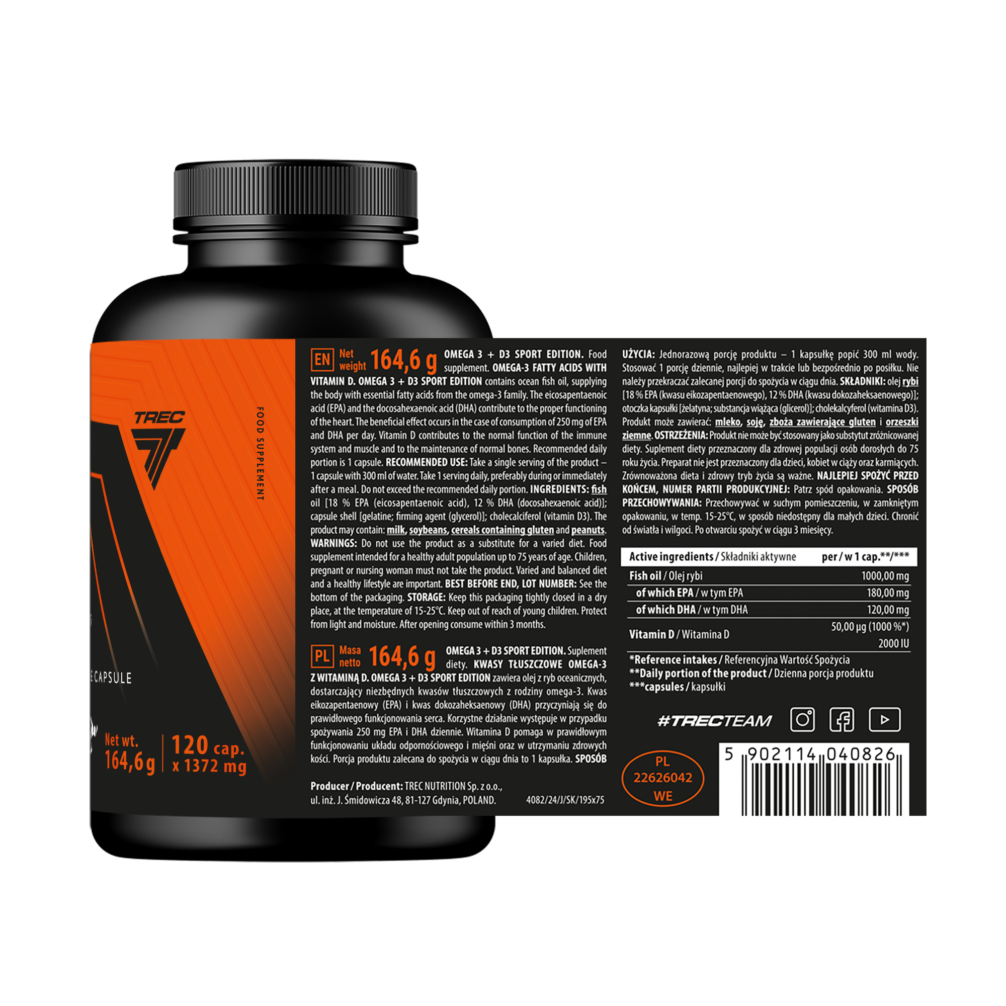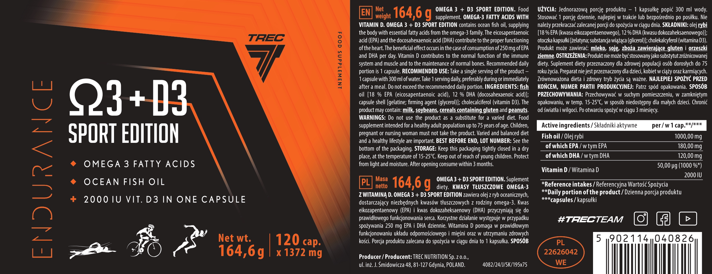 Endurance Omega 3 D3 Trec es un complemento alimenticio presentado en envase de 120 cápsulas que combina ácidos grasos omega 3 con vitamina D3. Está diseñado para integrarse dentro de planes de nutrición deportiva estructurados y rutinas diarias de suplementación.