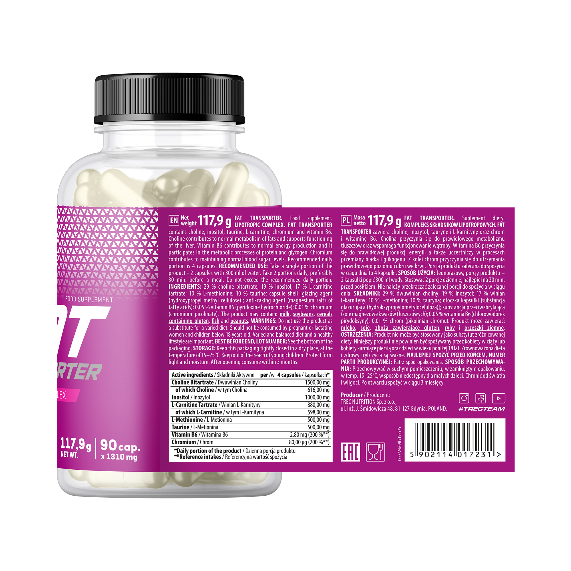 Fat Transporter Trec es un complemento alimenticio presentado en envase de 90 cápsulas diseñado para integrarse dentro de planes estructurados orientados al control del peso y la composición corporal. Su formato encapsulado permite una dosificación cómoda y organizada, facilitando su incorporación dentro de la suplementación diaria.