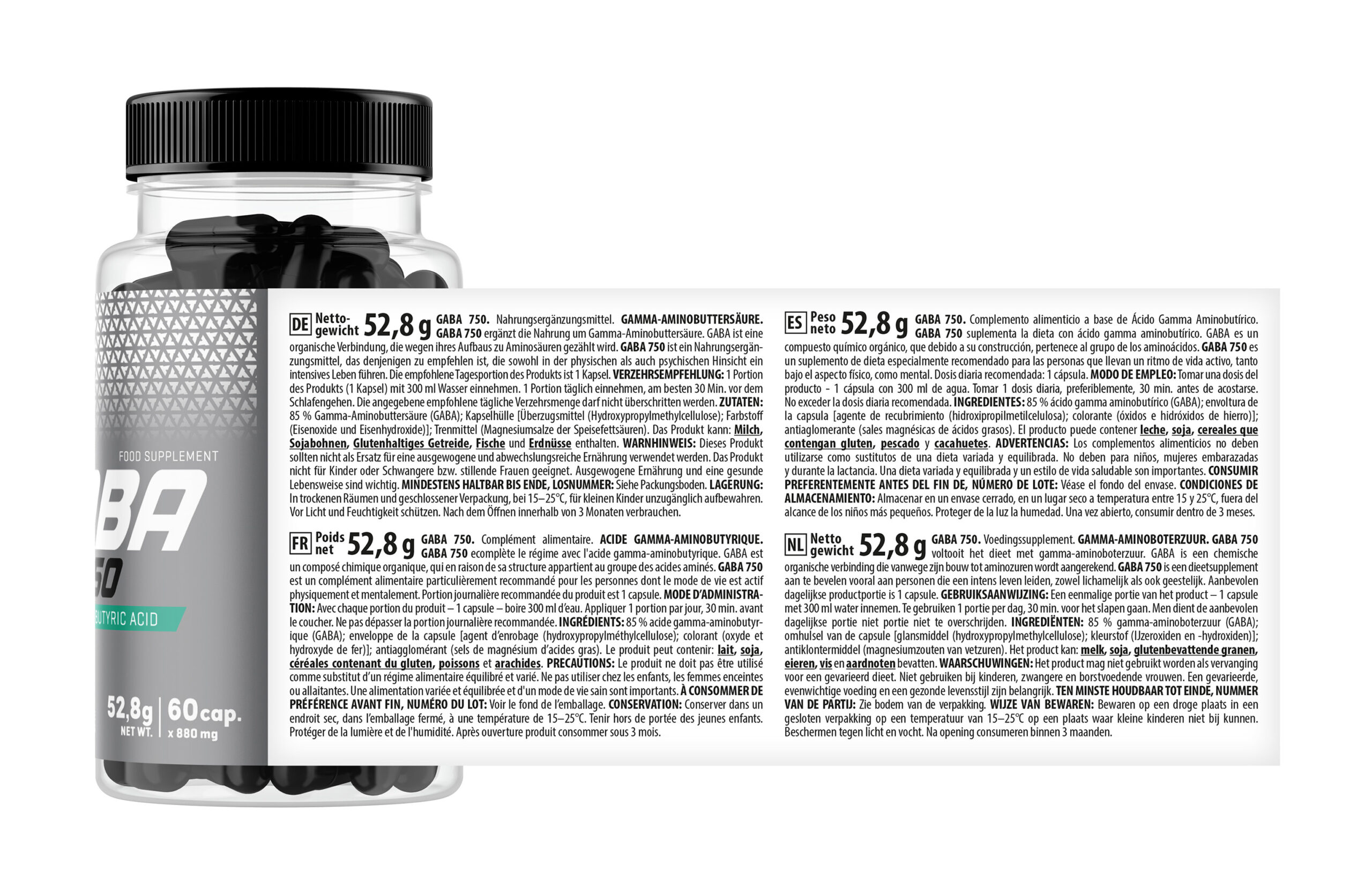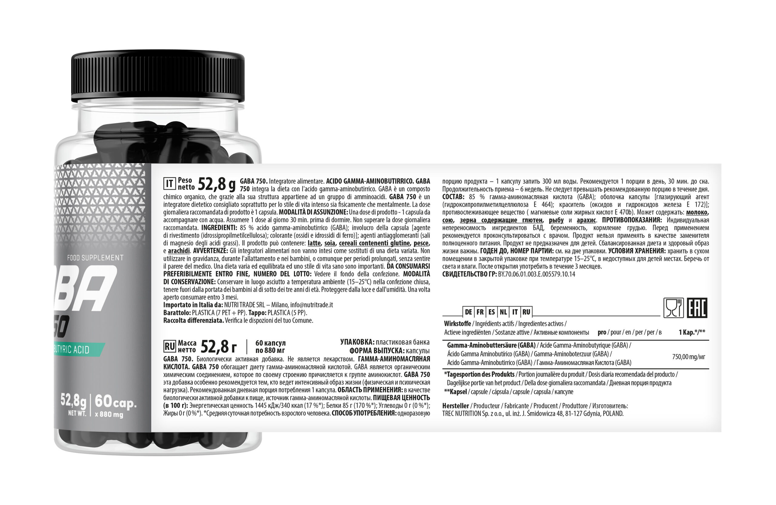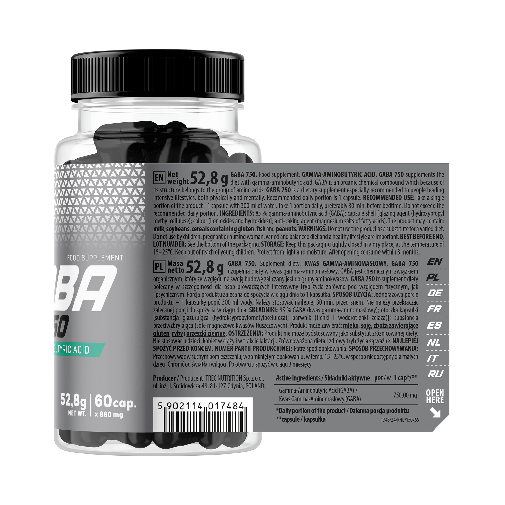 GABA 750 Trec es un complemento alimenticio presentado en envase de 60 cápsulas que aporta ácido gamma-aminobutírico en formato encapsulado. Está diseñado para integrarse dentro de rutinas estructuradas de suplementación diaria.