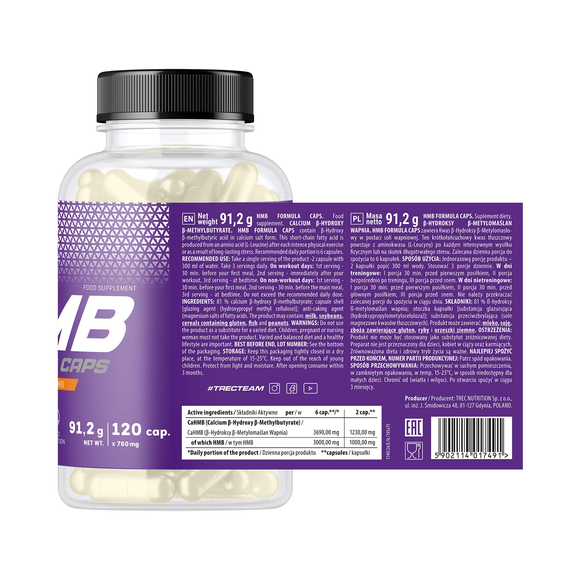 HMB Formula Trec es un complemento alimenticio presentado en envase de 120 cápsulas que aporta beta-hidroxi beta-metilbutirato (HMB) en formato encapsulado. Está diseñado para integrarse dentro de rutinas deportivas estructuradas y planes de suplementación organizados.