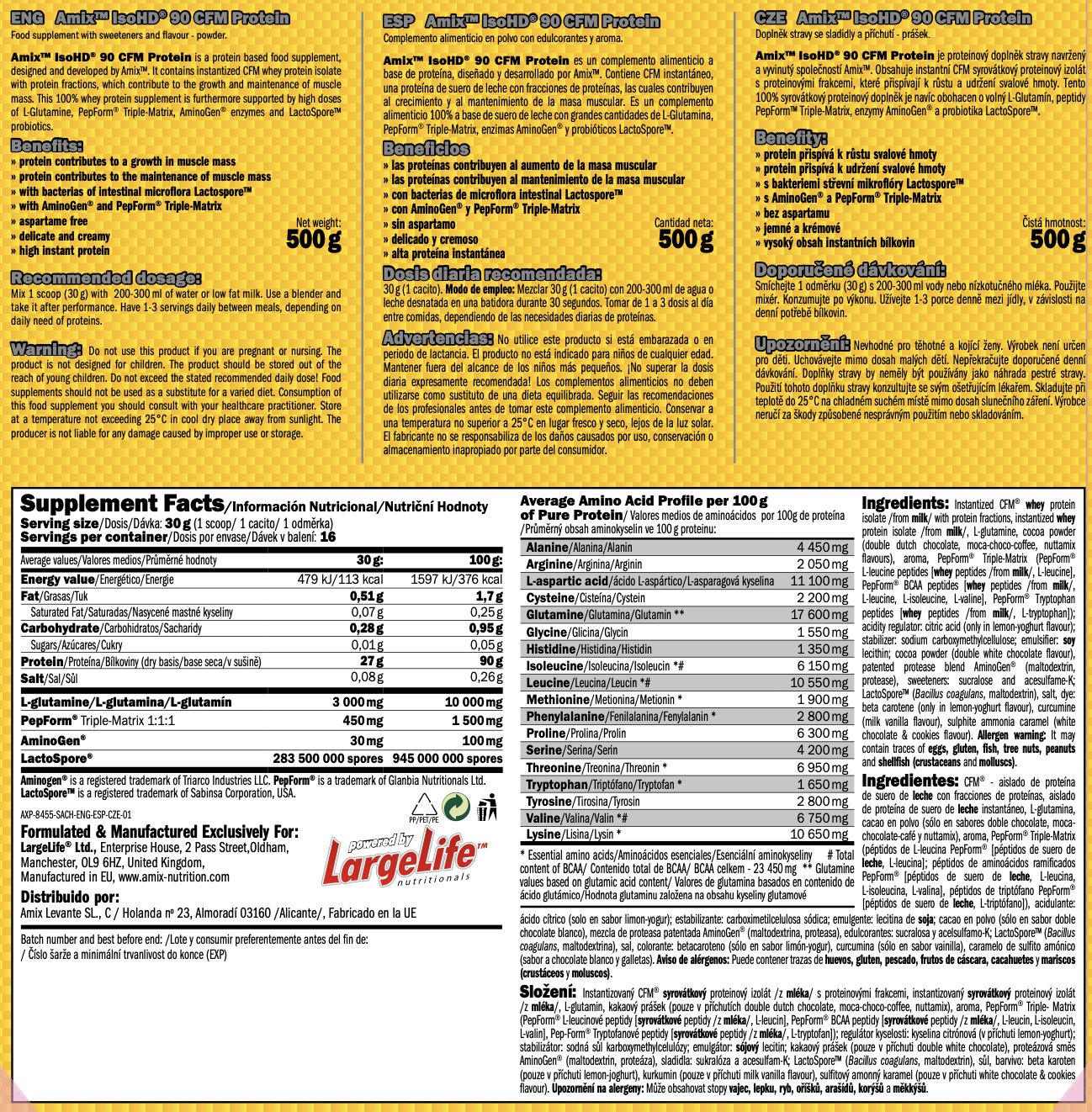 Asimismo, la ISO HD 90 CFM Amix Pro® aporta un perfil completo de aminoácidos esenciales y BCAA, fundamentales para la síntesis proteica y el mantenimiento muscular. Su excelente solubilidad y digestión ligera facilitan su consumo diario, incluso en personas con digestiones sensibles.