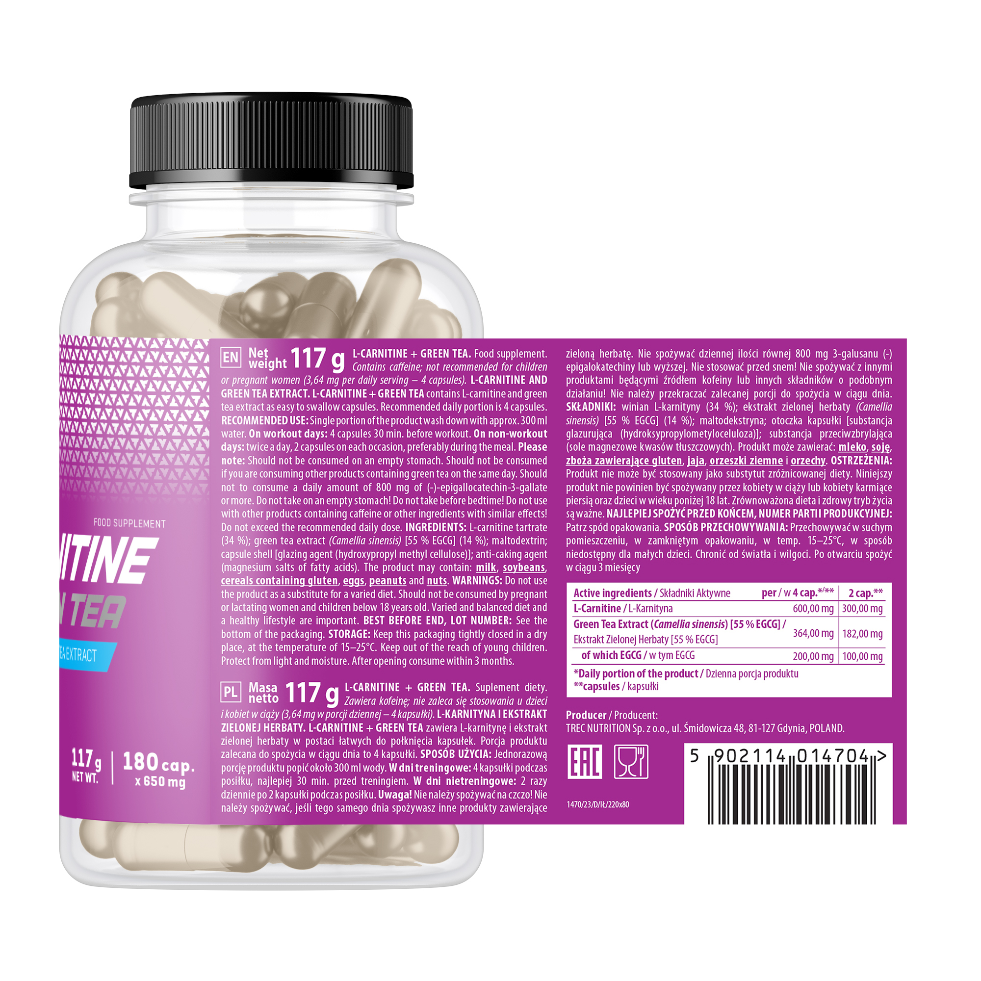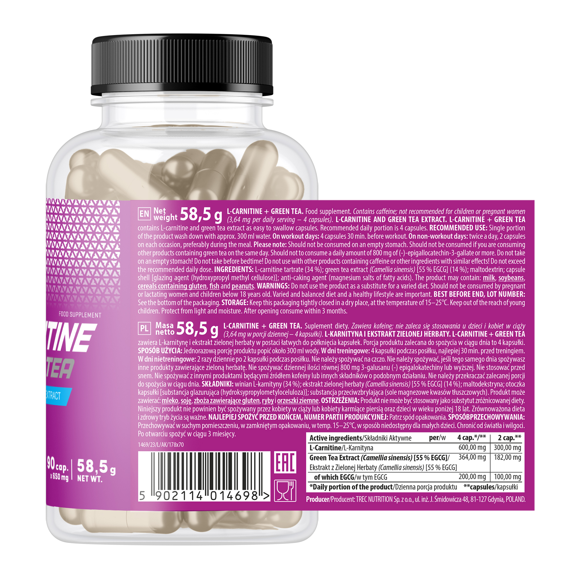 L-Carnitine Green Tea Trec es un complemento alimenticio presentado en formato cápsulas y disponible en envases de 90 y 180 unidades. Combina L-carnitina con extracto de té verde en una fórmula pensada para integrarse dentro de planes estructurados de nutrición deportiva.