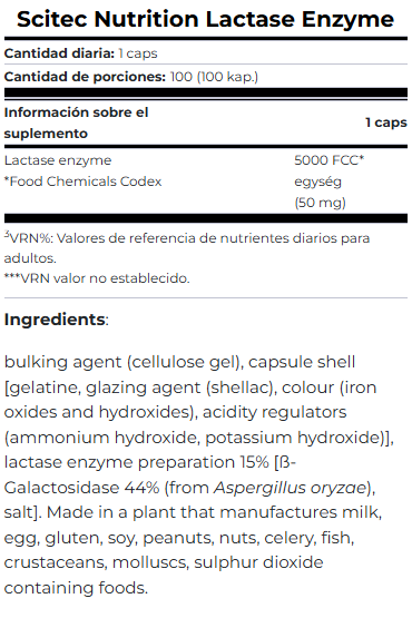 La Lactase Enzyme Scitec es un complemento alimenticio en cápsulas que aporta lactasa, una enzima digestiva responsable de descomponer la lactosa en glucosa y galactosa. La lactosa es el azúcar presente de forma natural en la leche y en productos derivados como yogur, queso o batidos proteicos que contienen suero.