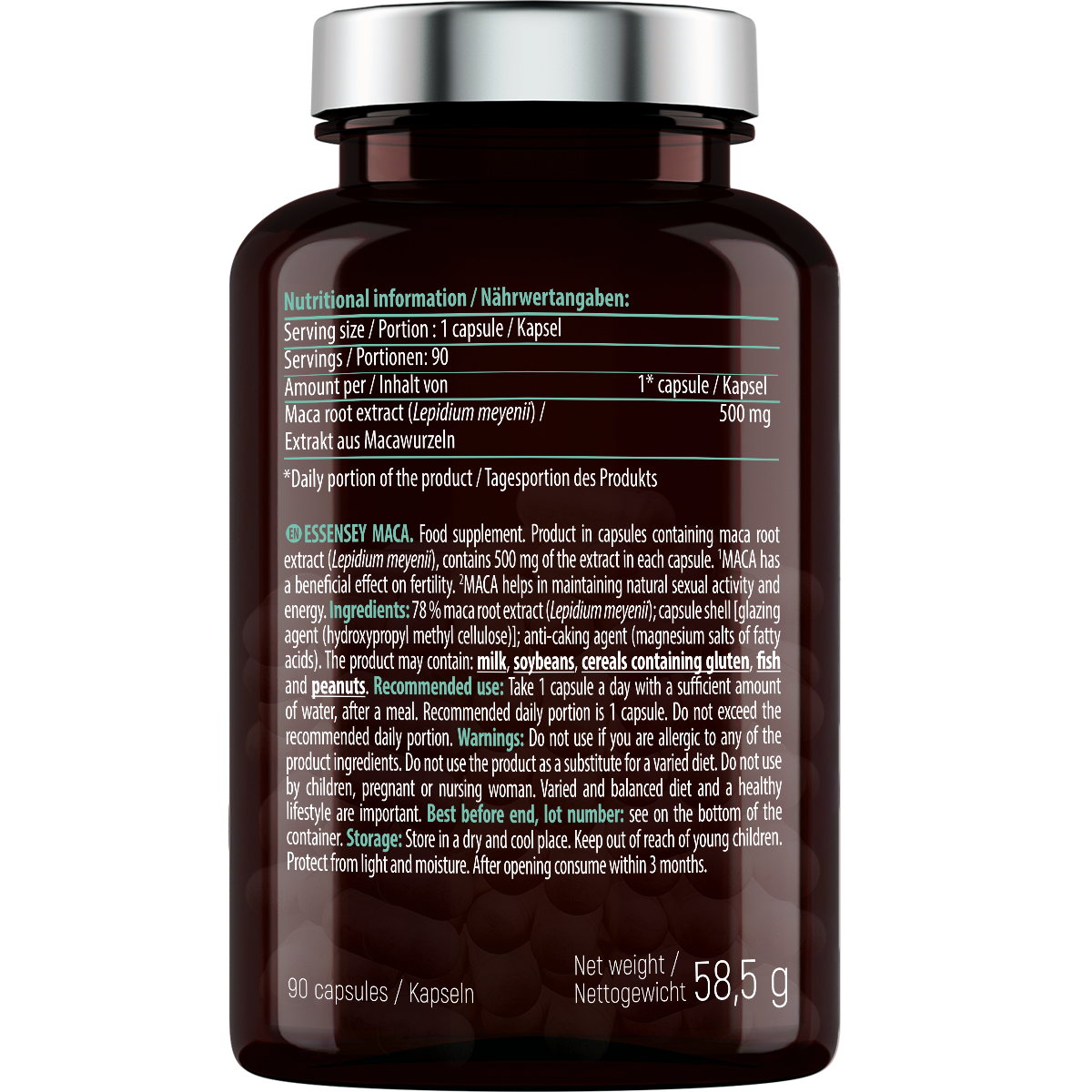 Essensey ha diseñado este producto con una composición clara y un formato fácil de utilizar. La maca es un ingrediente presente en distintos complementos alimenticios, por lo que este producto se adapta bien a diferentes estilos de vida y rutinas personales.
