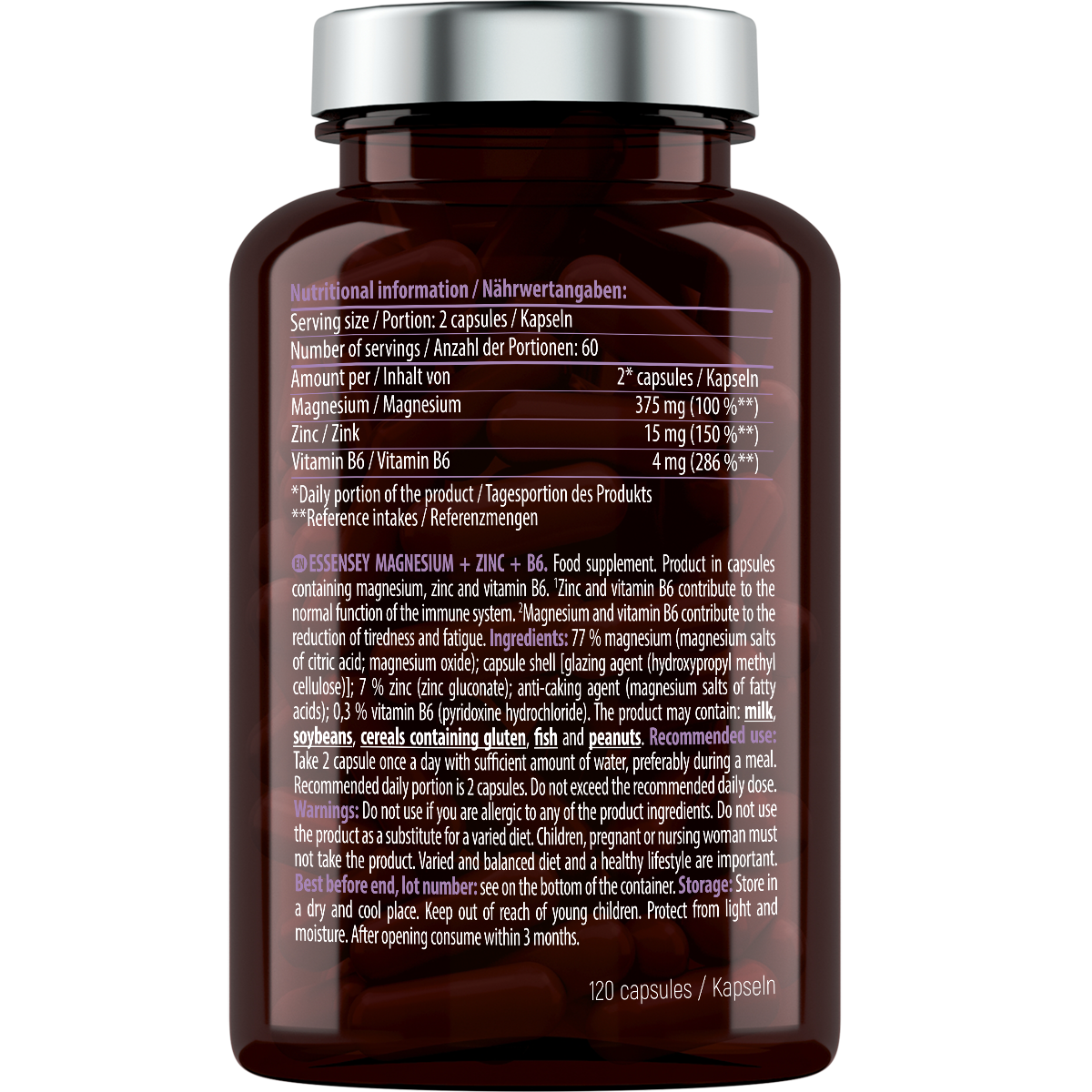 Essensey ha diseñado esta fórmula con una composición clara y un formato fácil de usar. El magnesio y el zinc son minerales ampliamente presentes en la suplementación diaria, mientras que la vitamina B6 forma parte del grupo de vitaminas B, por lo que este complemento se adapta bien a distintos estilos de vida y rutinas personales.