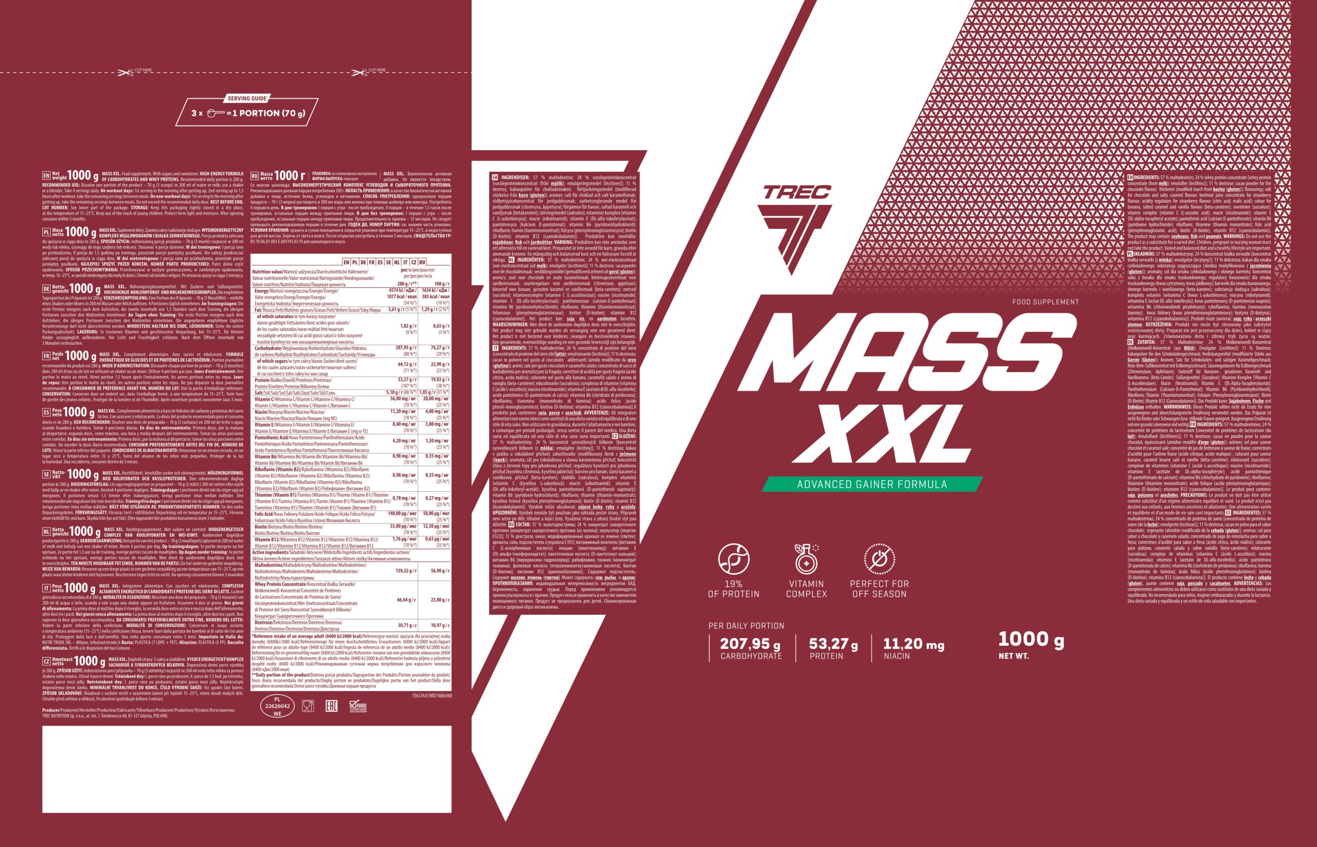Mass XXL Gainer Trec es un complemento alimenticio en formato polvo diseñado para integrarse dentro de planes estructurados de nutrición deportiva orientados al incremento calórico. Está disponible en envases de 1 kg y 3 kg, lo que permite adaptar la suplementación según la planificación individual.