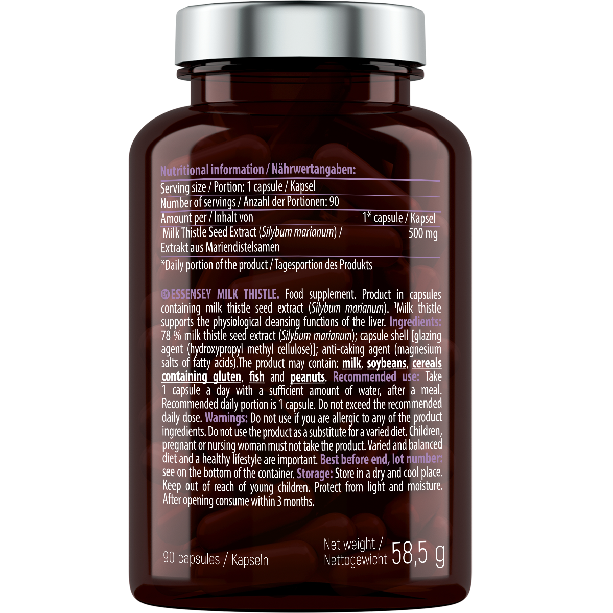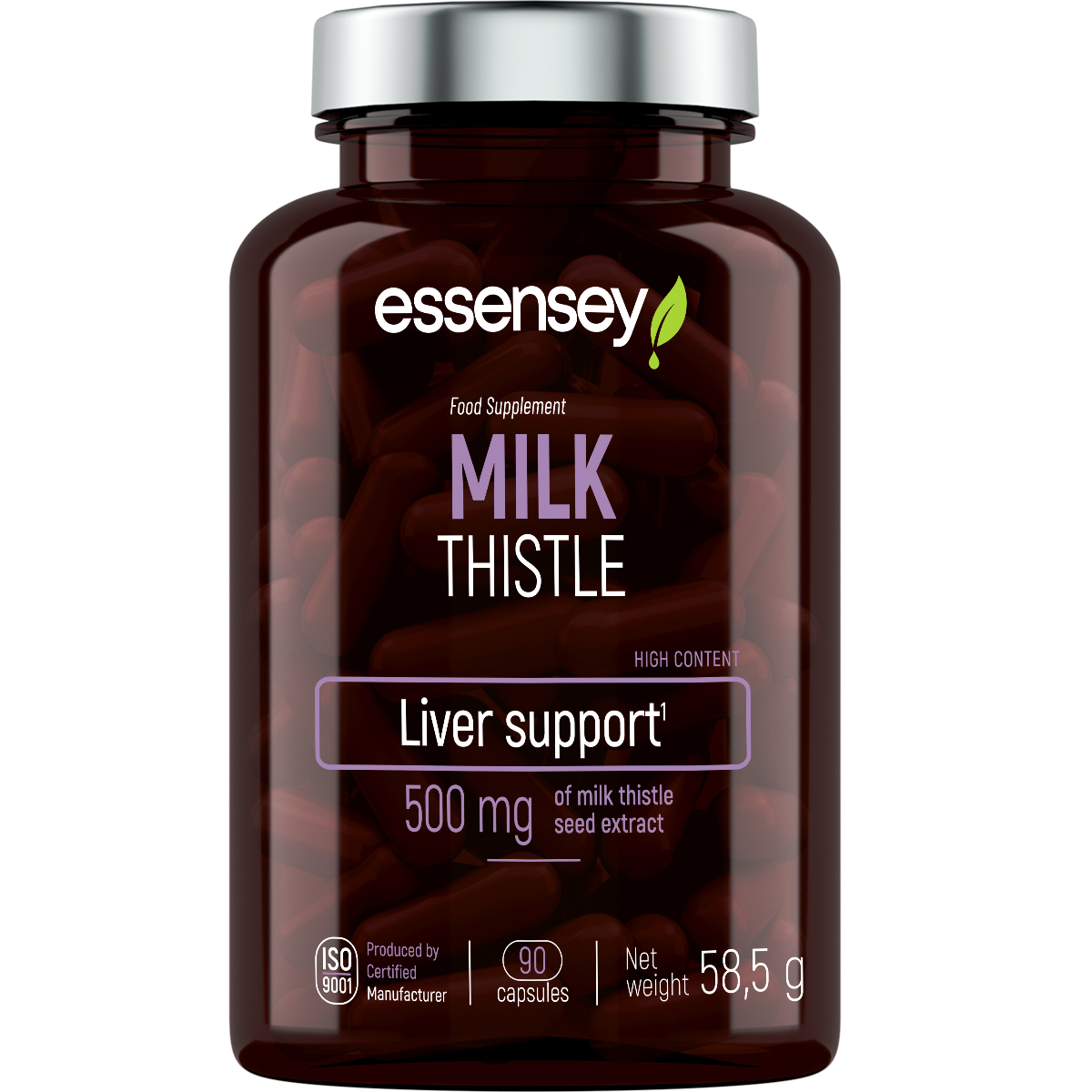 Milk Thistle Essensey es un complemento alimenticio presentado en un envase de 90 cápsulas, formulado a base de extracto de cardo mariano (Silybum marianum). Este producto ha sido desarrollado para facilitar la incorporación de ingredientes de origen vegetal dentro de una rutina diaria de suplementación.