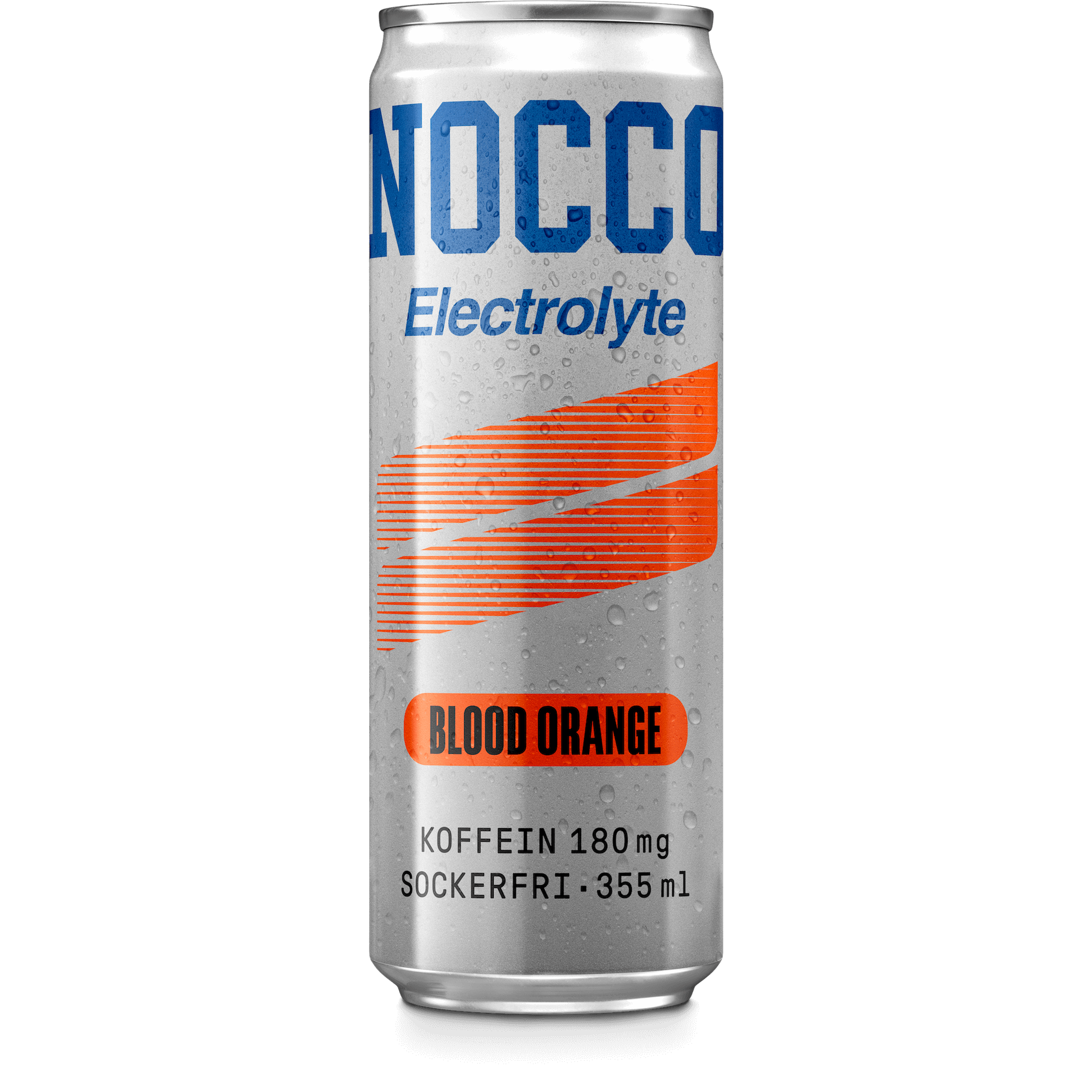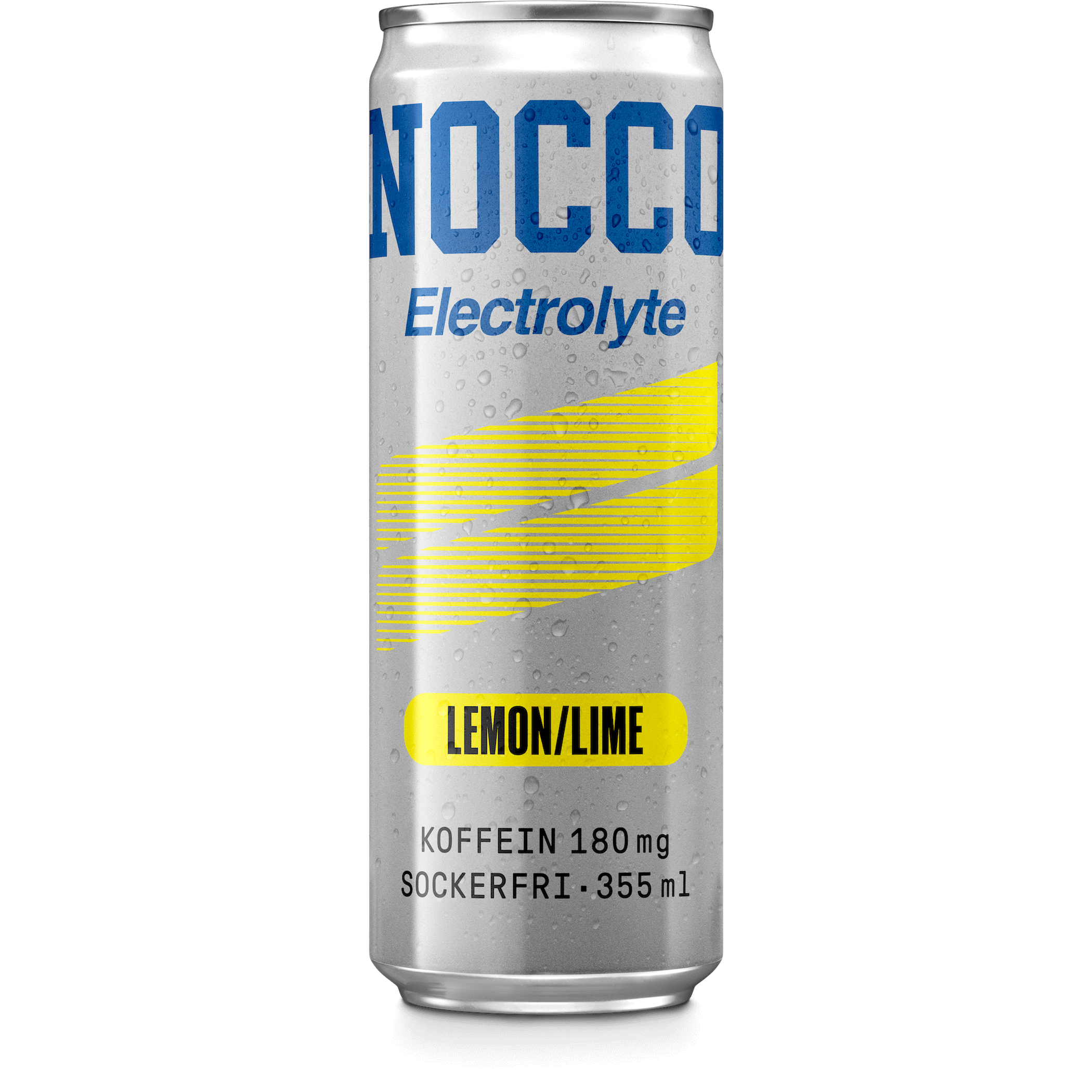NOCCO Electrolyte 355ml con cafeína y sin azúcares. Disponible en sabores naranja y lima-limón. Lata lista para consumir.