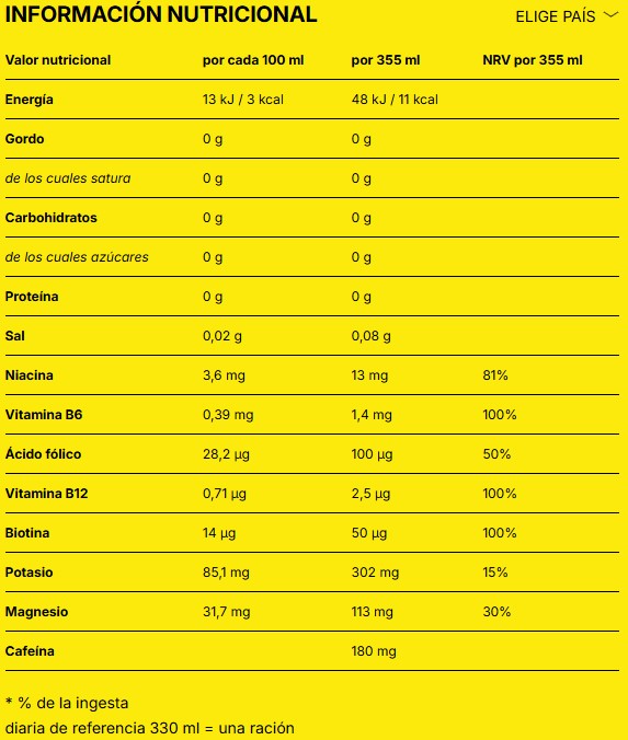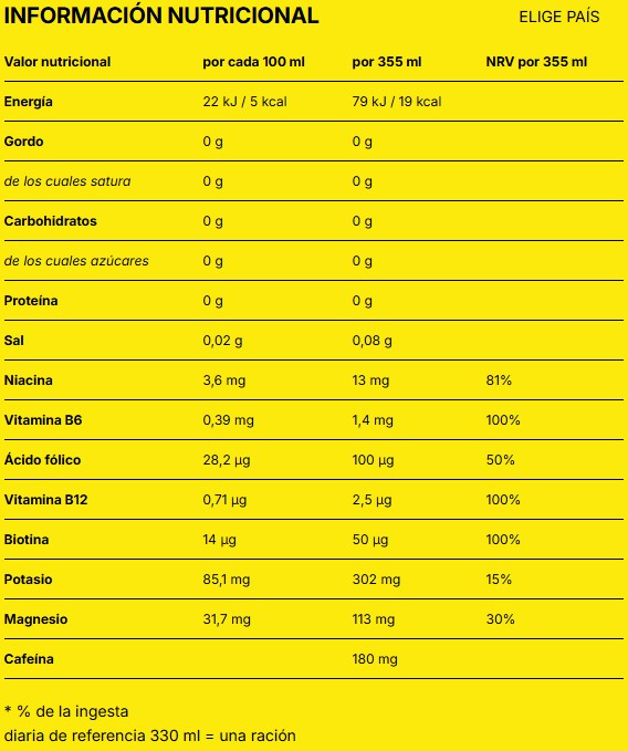 NOCCO Electrolyte 355ml incorpora cafeína, ingrediente habitual en bebidas energéticas orientadas a momentos de mayor actividad. Además, su formulación es sin azúcares, lo que permite incluirla dentro de rutinas donde se busca limitar el consumo de bebidas tradicionales azucaradas.