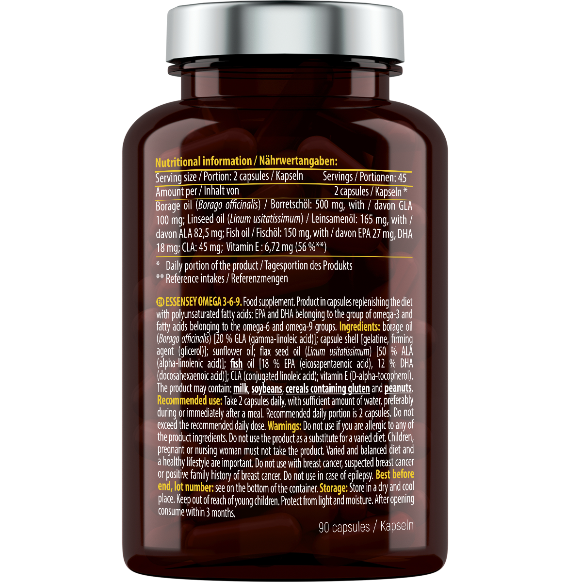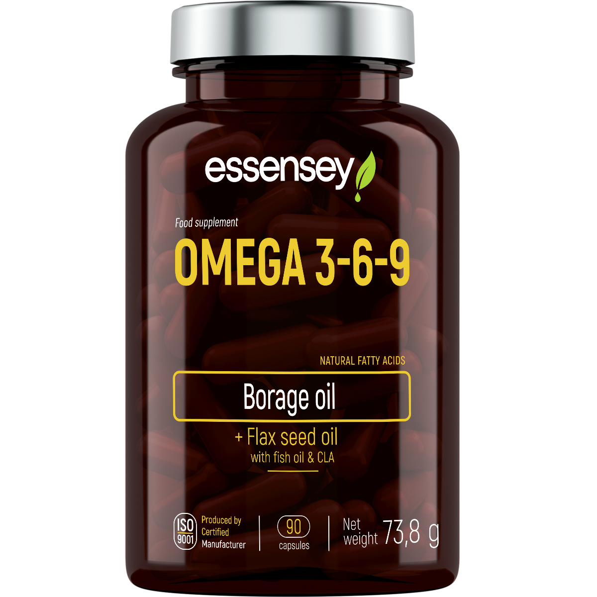 Omega 3-6-9 Essensey es un complemento alimenticio presentado en un envase de 90 cápsulas, formulado con una combinación de ácidos grasos omega 3, 6 y 9. Está diseñado para facilitar la incorporación de grasas esenciales dentro de una rutina diaria de suplementación.