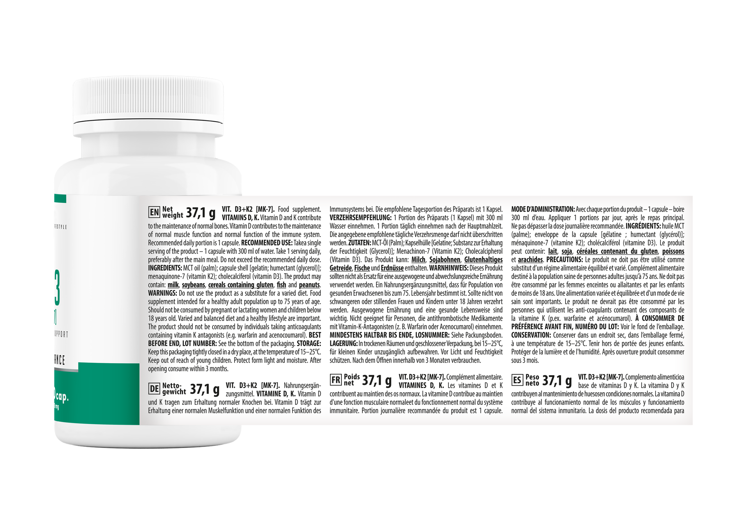 La vitamina D3 forma parte de la nutrición habitual y se encuentra asociada a la planificación dietética estructurada. Por su parte, la vitamina K2 en forma MK-7 es una variante utilizada en formulaciones combinadas debido a su estabilidad y uso frecuente en complementos nutricionales.