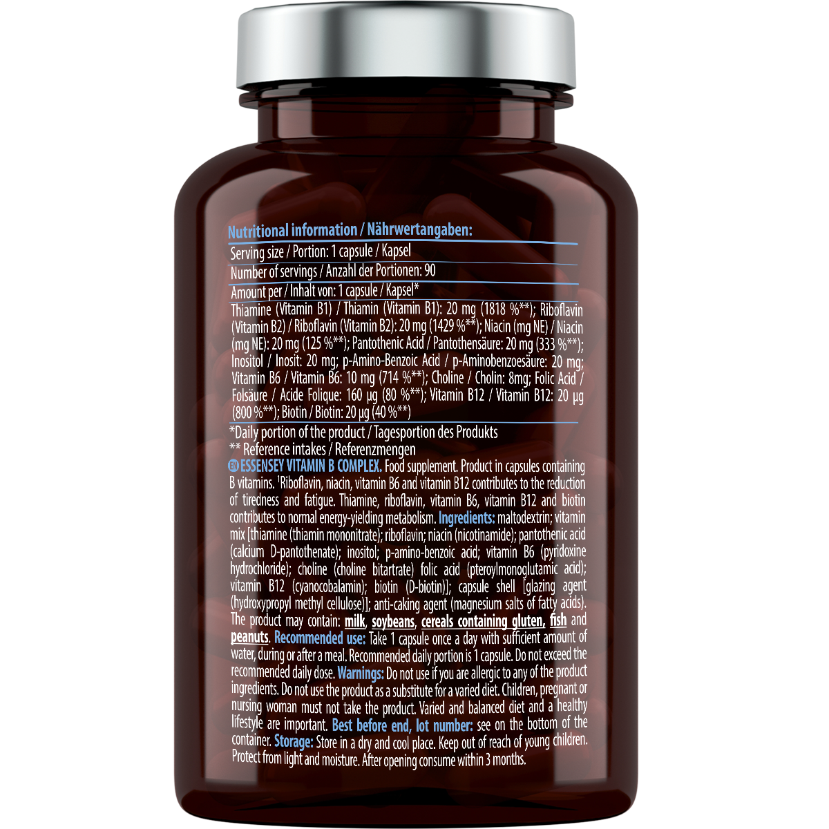 Vitamin B Complex Essensey es un complemento alimenticio presentado en un envase de 90 cápsulas, formulado con un conjunto de vitaminas del grupo B. Está diseñado para facilitar la incorporación de estos micronutrientes dentro de una rutina diaria de suplementación.