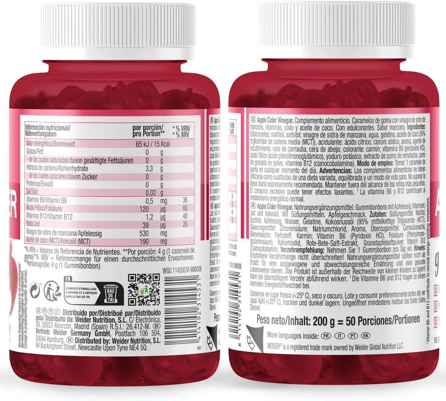 En conjunto, Weider Apple Cider Vinegar 50 gominolas sabor manzana ofrece una forma práctica de consumir vinagre de manzana mediante un formato cómodo y fácil de integrar en la rutina diaria.