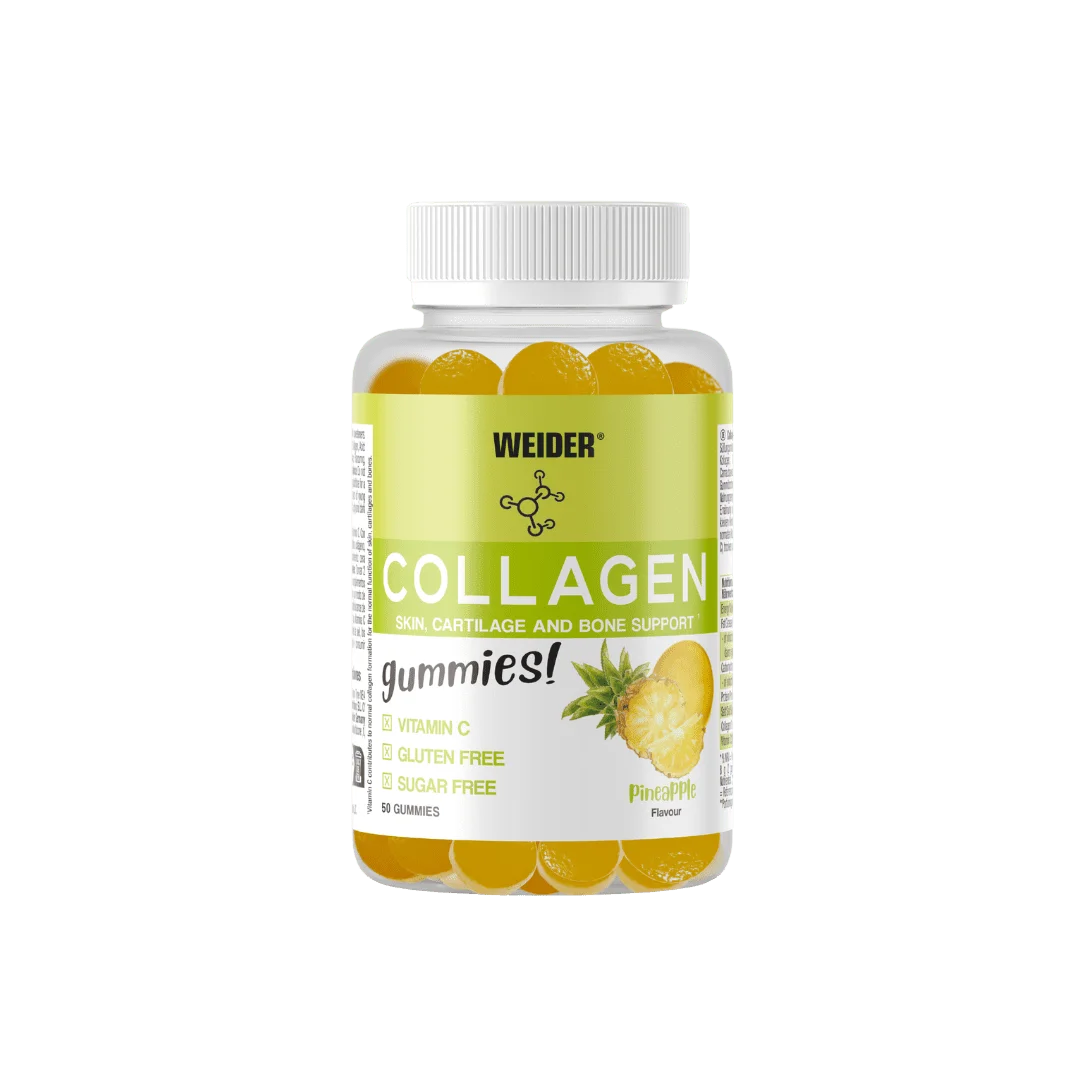 Collagen Gummies Weider sabor piña es un complemento alimenticio en formato de 50 gominolas diseñado para un consumo fácil dentro de la rutina diaria.