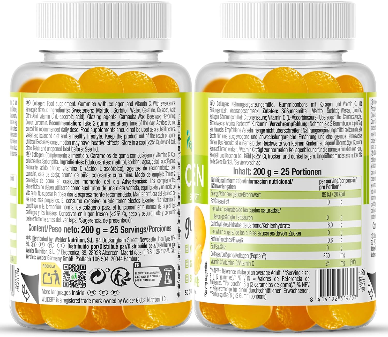 Collagen Gummies Weider sabor piña 50 gominolas es un complemento alimenticio en formato de gominolas que incorpora colágeno en una presentación práctica y fácil de consumir. Este tipo de formato se ha popularizado dentro del sector del bienestar por su comodidad frente a cápsulas o comprimidos tradicionales.