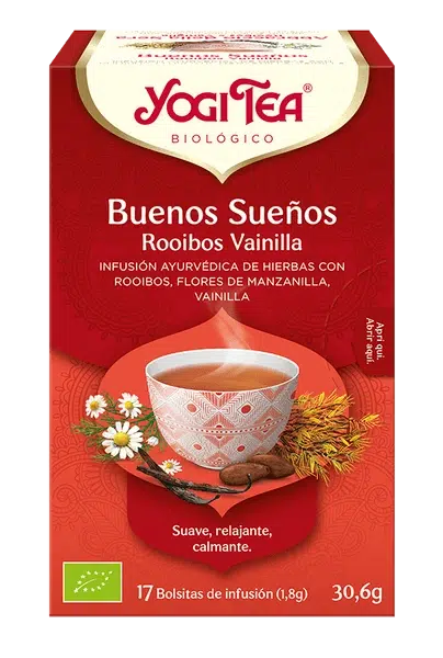 Yogi Tea Buenos Sueños Rooibos Vainilla se posiciona dentro de las infusiones orientadas a la rutina nocturna. Su formato de 17 bolsitas permite organizar el consumo diario sin necesidad de mediciones adicionales.