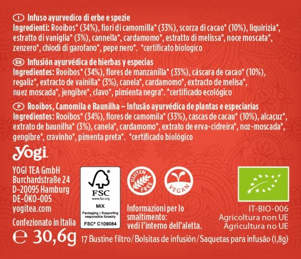 Yogi Tea Buenos Sueños Rooibos Vainilla 30,6g es una infusión presentada en formato de 17 bolsitas individuales de 1,8 gramos cada una, con un peso total de 30 gramos por caja. Este formato facilita la preparación y permite integrar la infusión en la rutina diaria de forma práctica.