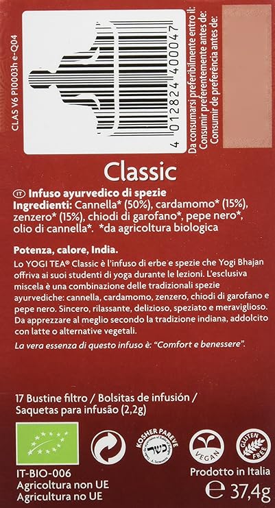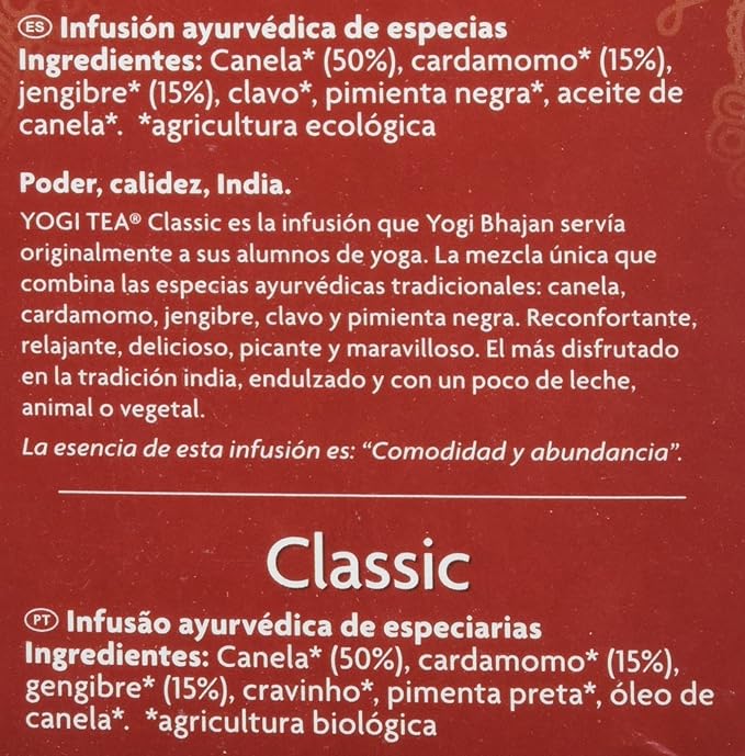 Yogi Tea Chai Classic 37,4g es una infusión presentada en formato de 17 bolsitas individuales de 2,2 gramos cada una, con un peso total de 37,4 gramos por caja. Este formato facilita la preparación diaria y permite integrar la infusión dentro de una rutina organizada.