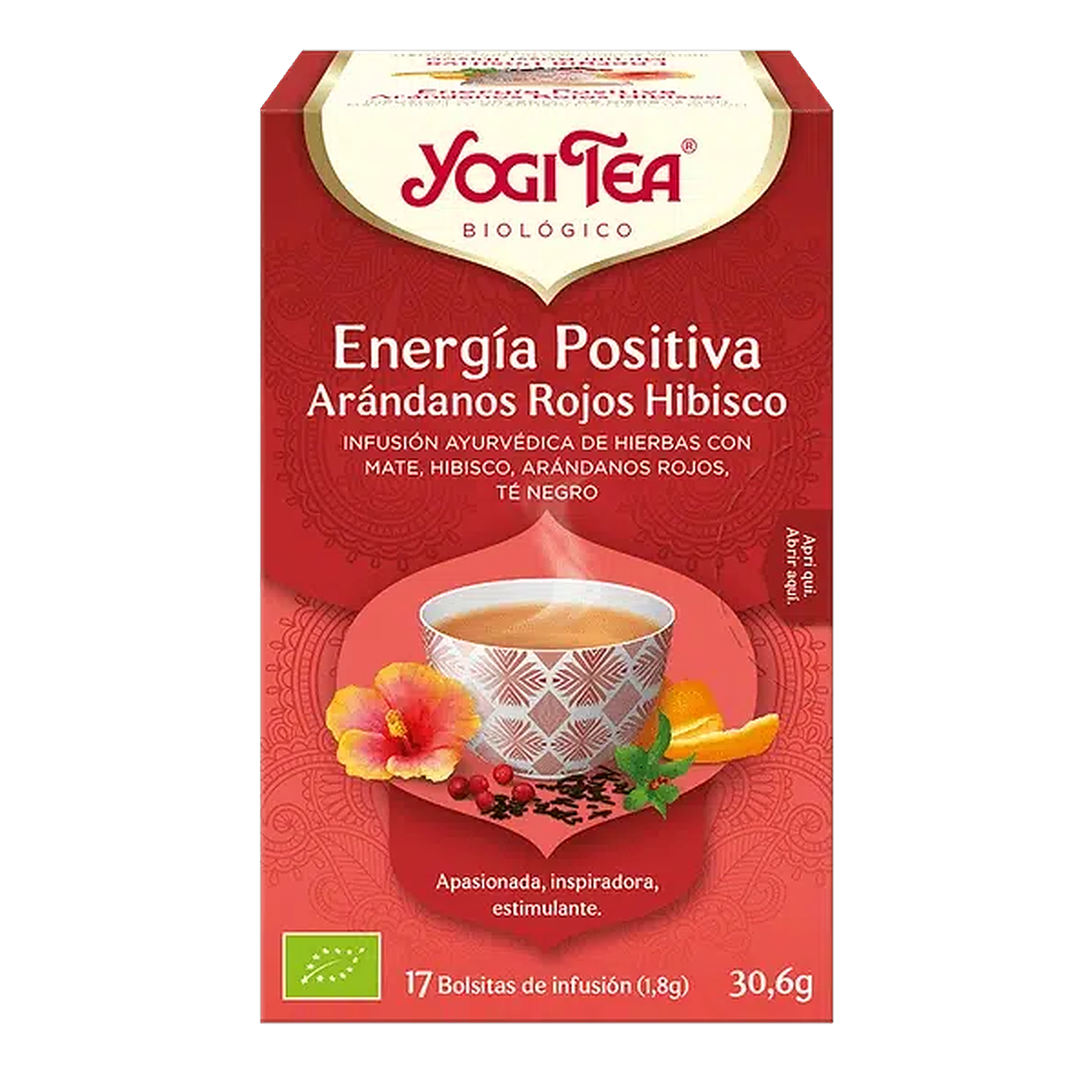 Yogi Tea Energía Positiva Arándanos Rojos Hibisco es una infusión ecológica elaborada a partir de una combinación equilibrada de hierbas, frutas y especias seleccionadas. Esta mezcla reúne ingredientes de origen natural cuidadosamente elegidos para ofrecer una bebida aromática con un perfil de sabor afrutado y ligeramente ácido.